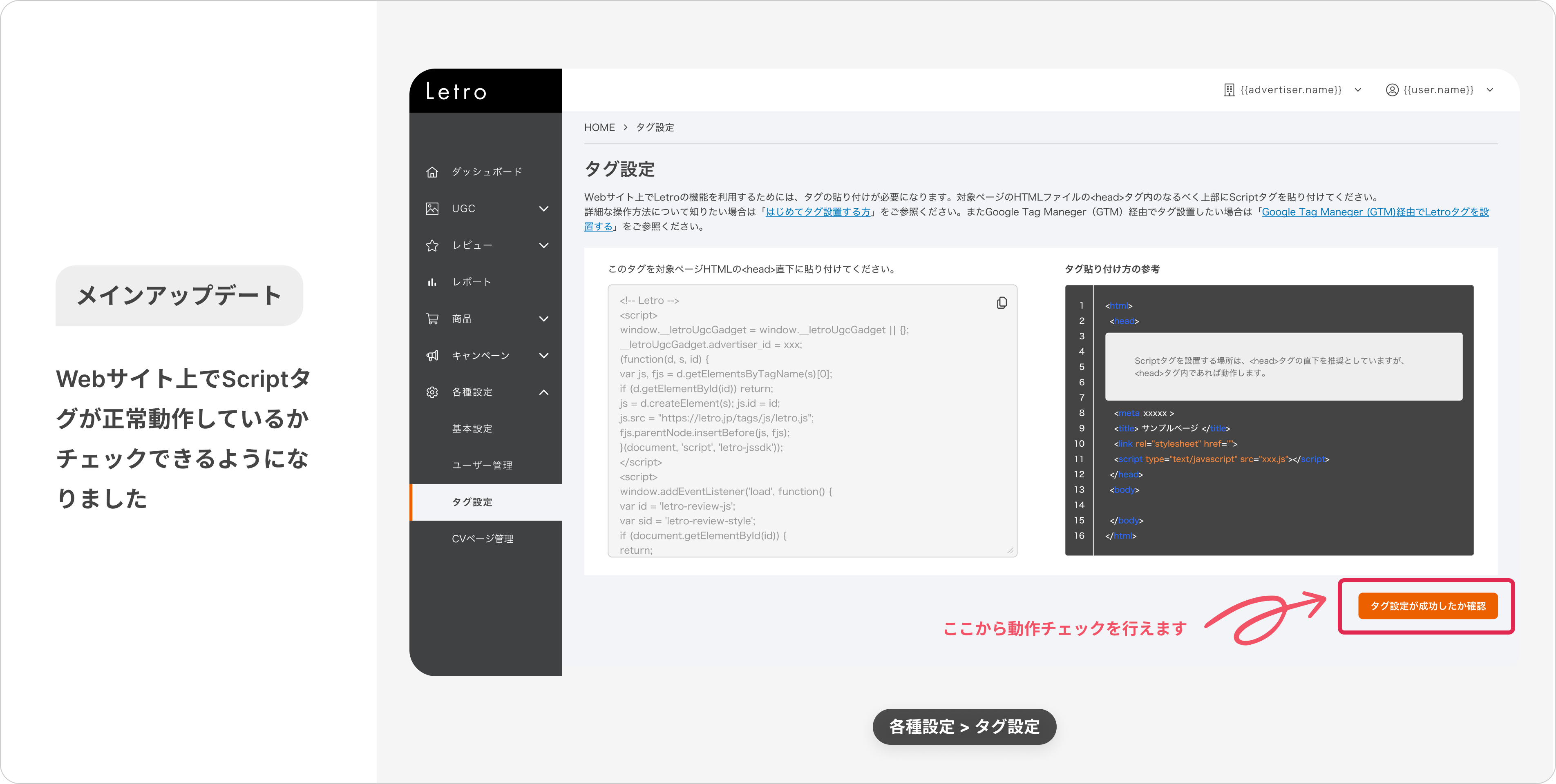 LetroのScriptタグを導入したWebサイト上で、タグの正常動作を簡単に確認できる新機能をリリースしました。このアップデートにより、ご利用者様がLetroを導入する際のタグ設置ミスに気づきやすくなるため、UGC(Instagram投稿、レビュー投稿)をトラブルなくスムーズにページ公開できるようになります。