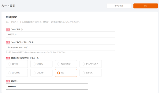 • 接続しているECプラットフォーム:「W2」を選択してください。