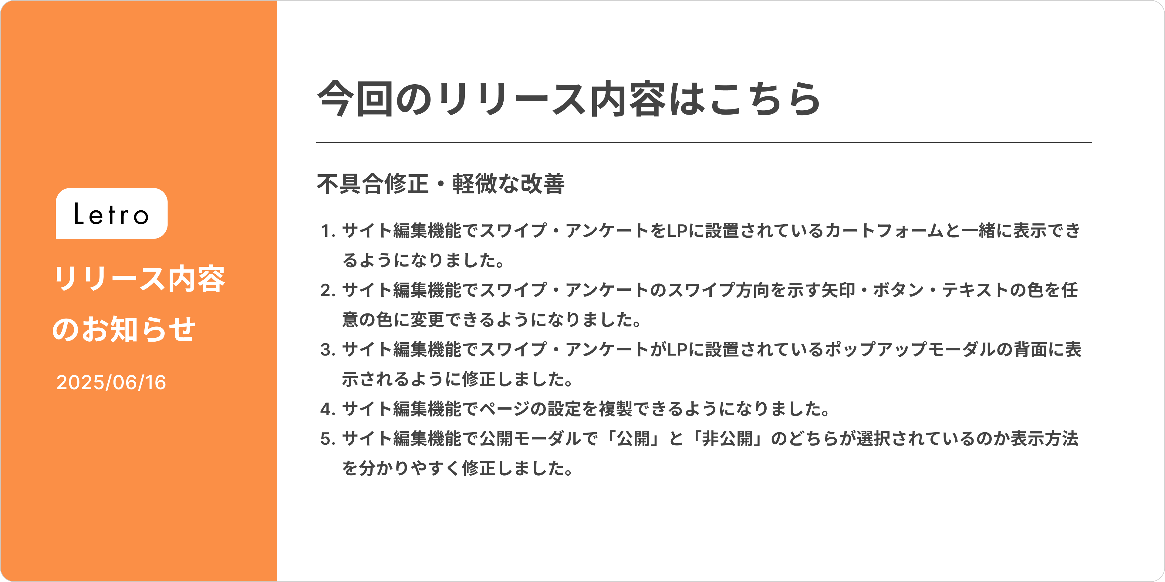 2025/06/16 サイト編集機能でスワイプ・アンケートをLPに設置されているカートフォームと一緒に表示できるようになりました 2025年06月16日 01:59 更新 フォローする 👍🏻 不具合修正・軽微な改善 サイト編集機能でスワイプ・アンケートをLPに設置されているカートフォームと一緒に表示できるようになりました。 サイト編集機能でスワイプ・アンケートのスワイプ方向を示す矢印・ボタン・テキストの色を任意の色に変更できるようになりました。 サイト編集機能でスワイプ・アンケートがLPに設置されているポップアップモーダルの背面に表示されるように修正しました。 サイト編集機能でページの設定を複製できるようになりました。 サイト編集機能で公開モーダルで「公開」と「非公開」のどちらが選択されているのか表示方法を分かりやすく修正しました。