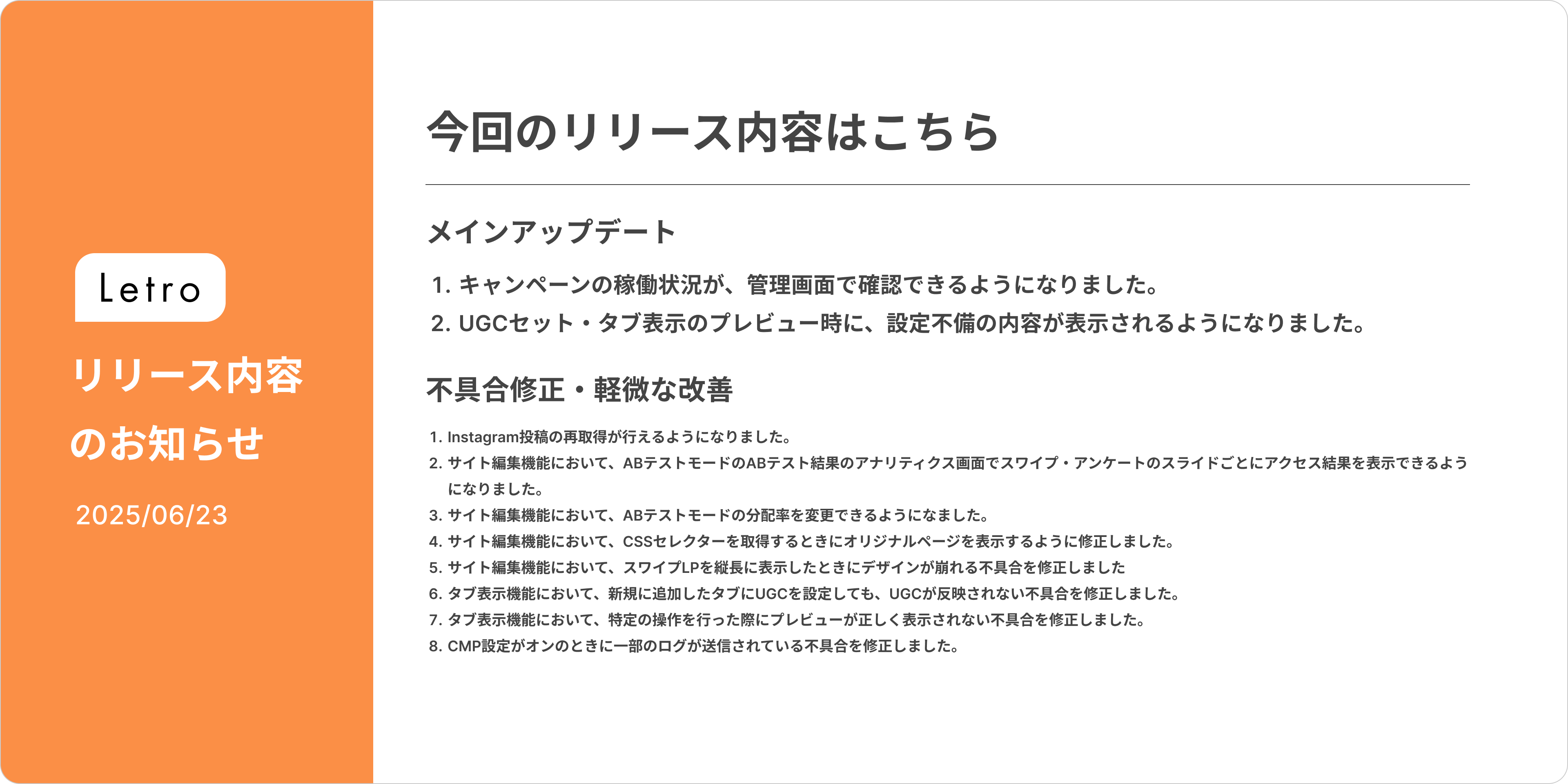 サイト編集機能において、スワイプLPを縦長に表示したときにデザインが崩れる不具合を修正しました。